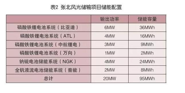 国家电网公司在河北省张北建设了风光储输示范项目,为100MW风电和40MW光伏项目配置了20MW/95MWh的储能,储能部分采用锂电池、钠硫电池和全钒液流电池三种技术,由不同厂家提供,如下表所示: