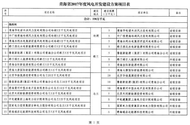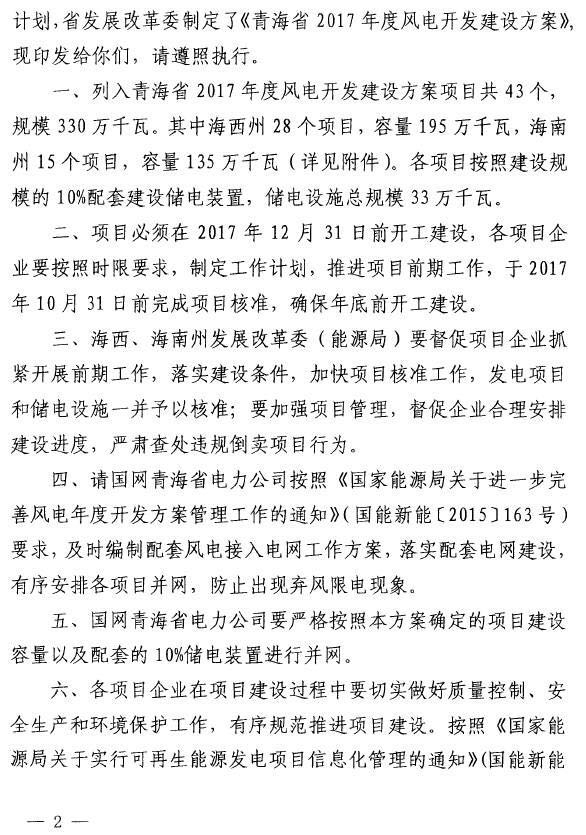 青海此次配置的43个、总计3.3GW的风电项目分别位于海西州(28个、1.95GW)和海南州(15个、1.35GW)。这些项目被要求在2017年10月底前完成核准,年底前开工建设。建成并网时,国网青海电力公司将严格要求配套的10%储电装置进行并网。