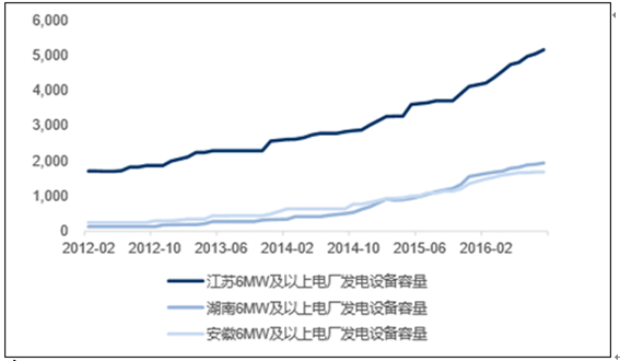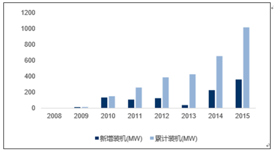 2015年,我国新增海上风电装机100台,容量达到360.5MW,同比增长58.4%。截至2015年底, 我国累计建成海上风电项目装机容量1014.68MW。 • 海上风电单机容量已由最初的600kw增至2MW、4MW和5MW等更大容量风机。在所有吊装 的海上风电机组中,2.5MW机组装机容量占比18.48%,3MW机组装机容量占比17.74%, 4MW机组装机容量占比34.69%。 • 南方地区大容量、低风速机组更受市场青睐。随着我国风电市场日趋成熟,竞争环境更为理性。 加之电价下调政策带来的压力,市场竞争热点将逐步由风资源富集地区向低风速地区转移