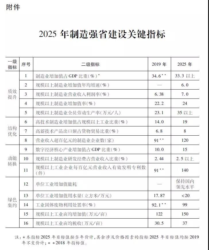 (三)发展目标。到2025年,制造业增速、质量和效益更加协调,结构更趋合理,动力更为强劲,发展方式更可持续,创新文化更富活力,建成国内领先、具有国际影响力的制造强省。
