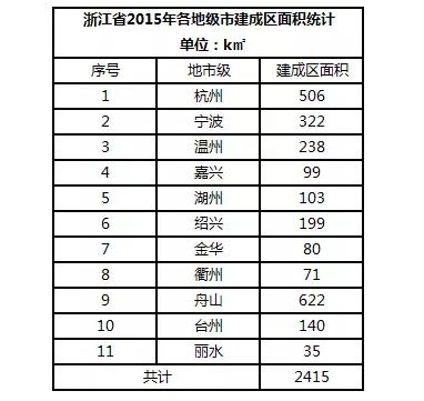 表2:2015年浙江省各地级市建成区面积统计(单位: k㎡)