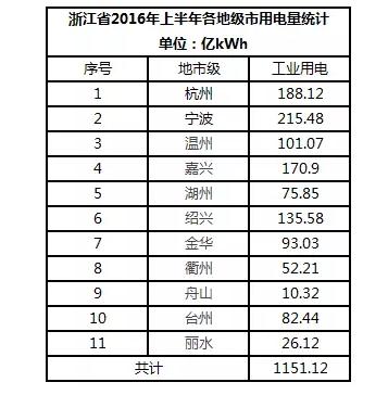 表 3:2016年上半年浙江省各地级市工业用电量统计(单位:亿kWh)