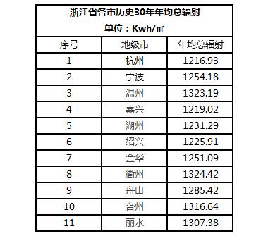 表5:浙江各地级市的年均总辐射(单位:Kwh/㎡)