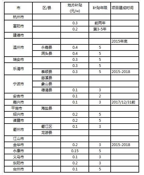 浙江省省补:0.1元/W,补贴年限为20年。市县级补贴如下表,未明确补贴标准的市县区,按上一级补贴标准进行补贴。