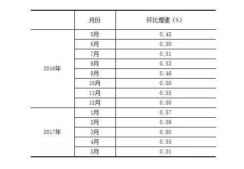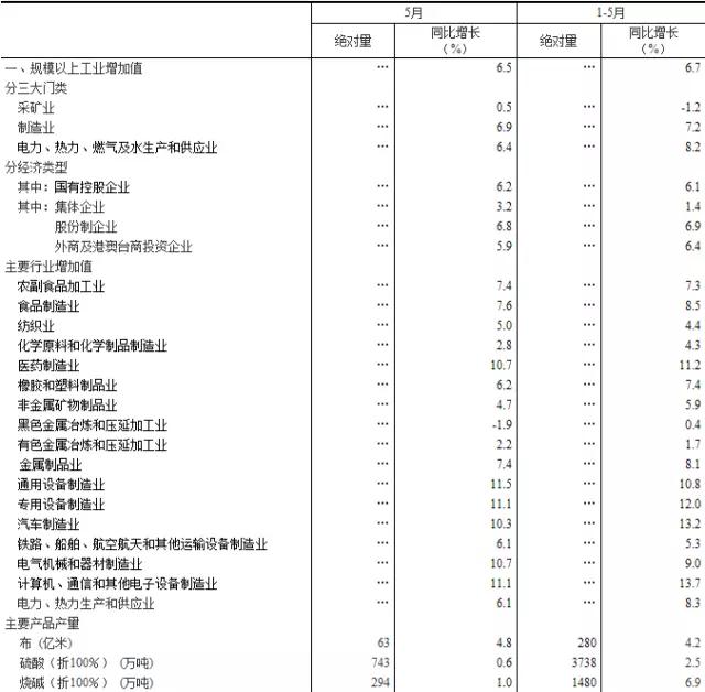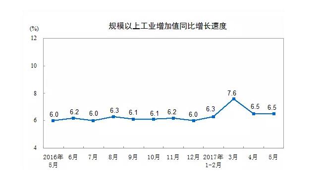 2017年5月份,规模以上工业增加值同比实际增长6.5%(以下增加值增速均为扣除价格因素的实际增长率),与4月份持平。从环比看,5月份,规模以上工业增加值比上月增长0.51%。1-5月份,规模以上工业增加值同比增长6.7%。
