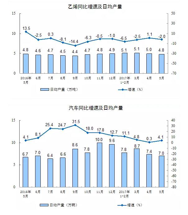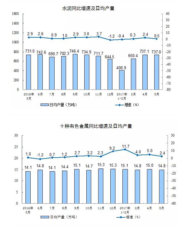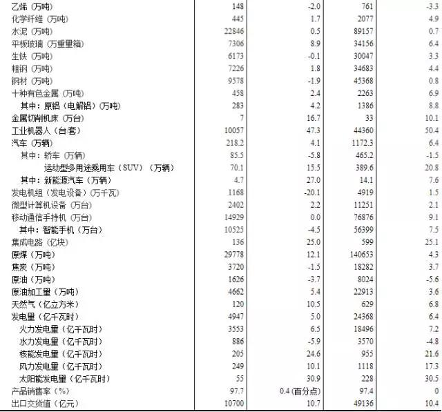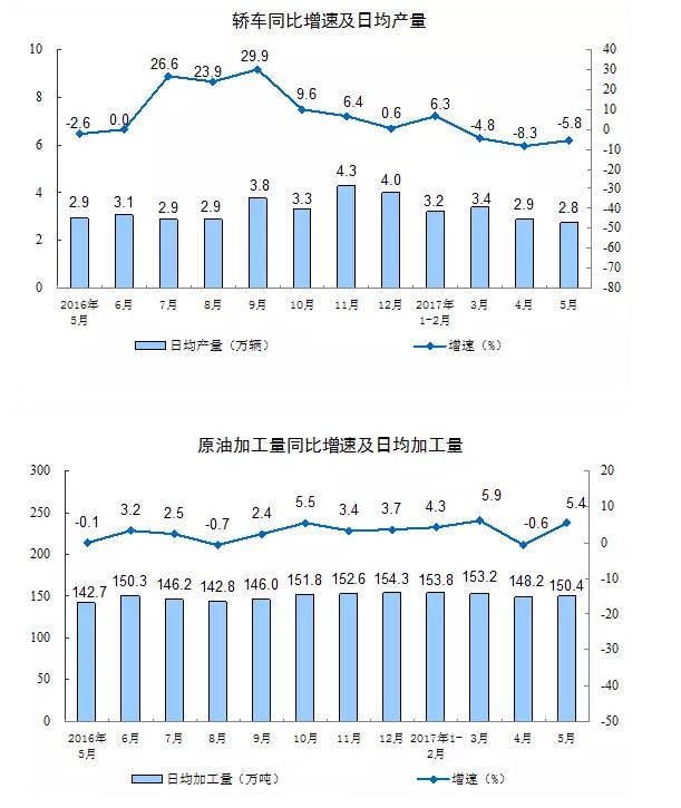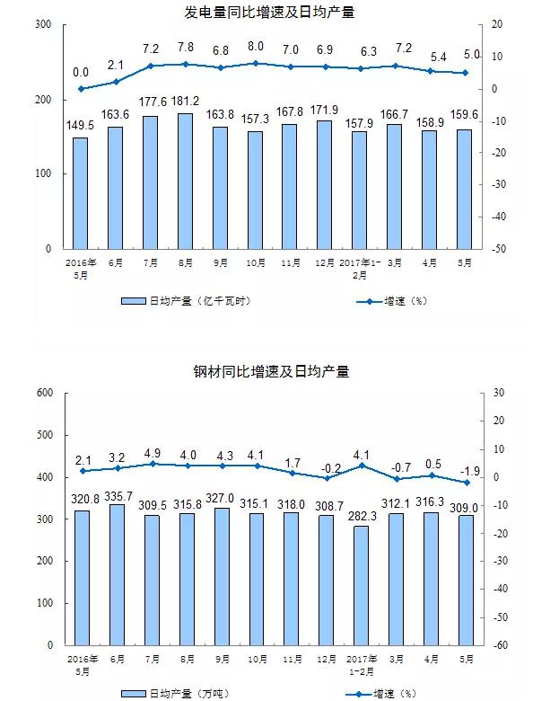分产品看,5月份,596种产品中有408种产品同比增长。其中,钢材9578万吨,同比下降1.9%;水泥22846万吨,增长0.5%;十种有色金属458万吨,增长2.4%;乙烯148万吨,下降2.0%;汽车218.2万辆,增长4.1%;轿车85.5万辆,下降5.8%;发电量4947亿千瓦时,增长5.0%;原油加工量4662万吨,增长5.4%。