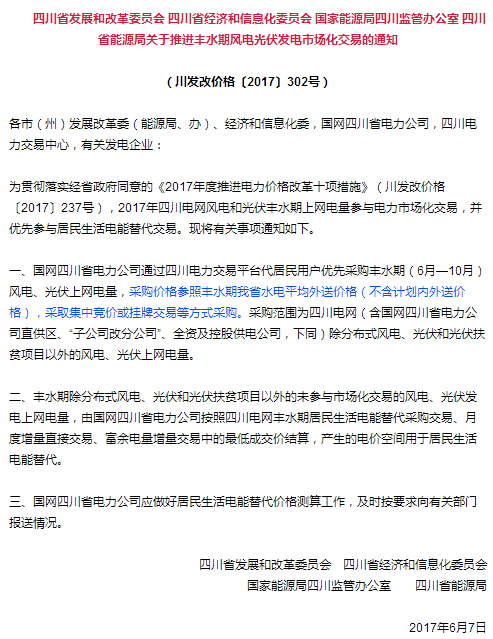 近日四川省发展和改革委员会、四川省经济和信息化委员会、国家能源局四川监管办公室、四川省能源局四部委联合发布《关于推进丰水期风电光伏发电市场化交易的通知》。通知指出,国网四川省电力公司通过四川电力交易平台代居民用户优先采购丰水期(6月—10月)风电、光伏上网电量,采购价格参照丰水期我省水电平均外送价格(不含计划内外送价格),采取集中竞价或挂牌交易等方式采购。采购范围为四川电网(含国网四川省电力公司直供区、“子公司改分公司”、全资及控股供电公司,下同)除分布式风电、光伏和光伏扶贫项目以外的风电、光伏上网电量。以下为通知原文:
