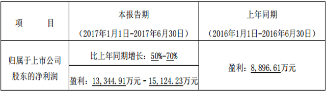 亿纬锂能(300014)6月7日晚间发布2017年半年度业绩预告,预计上半年归属于上市公司股东的净利润13,344.91万元-15,124.23万元,比上年同期增长50%-70%。