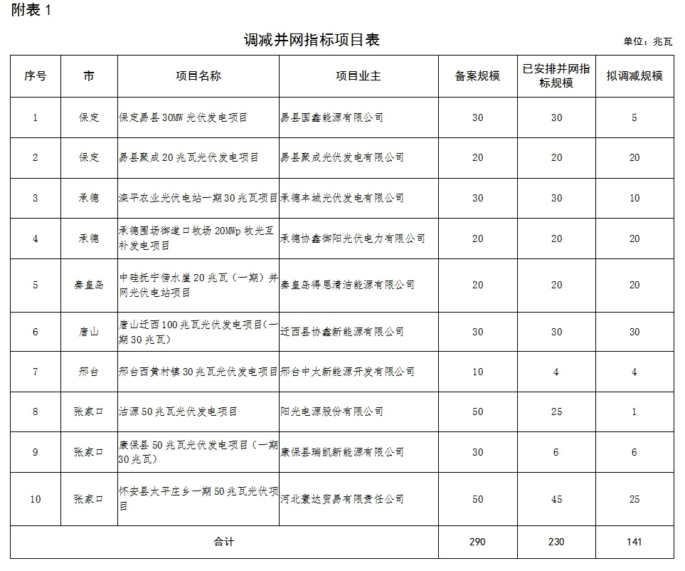 按照河北省能源局《关于对光伏发电项目开展核查摸底工作的紧急通知》和《关于组织企业出具并网承诺函的紧急通知》要求,经各市上报、企业承诺和省级电网公司确认,现对2016年普通光伏发电项目并网计划调整有关情况予以公示。