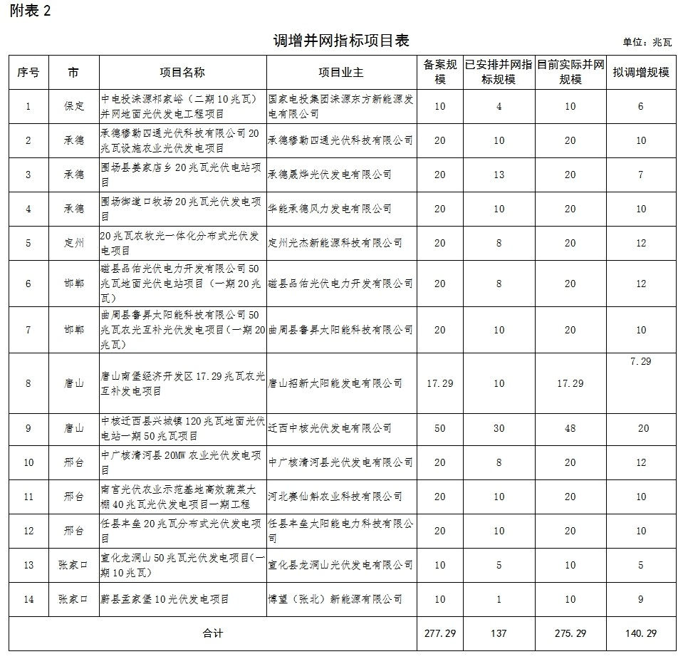 河北省2016年普通光伏发电项目并网指标调整情况公示