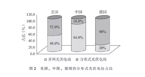 截至2014年年底,全球光伏电站装机容量为1.89亿KW,同比增长35.9%,全年光伏新增装机容量为4700万KW,同比增长21.7%,其中一半以上是分布式光伏电站。截至2014年年底,美国的光伏发电装机容量为1202万KW,其中分布式光伏电站并网装机容量为625万KW,占比约52%;德国光伏电站装机容量为3590万KW,其中分布式电站装机容量为2800万KW,占比约80%(见图2)。