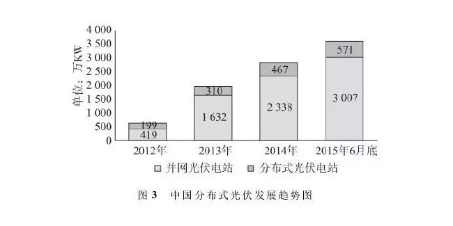 目前,全国28个有分布式光伏发电项目的省份中,浙江、湖南、广东等地区的分布式光伏发电占比较高。此外,中国分布式光伏发电装机容量超过100MW的省份超过10个,成为世界分布式光伏领域的重要市场。截至2015年6月底,光伏电站装机容量达3578万KW,其中分布式光伏电站装机容量达571万KW,占比16.0%,近年来中国分布式光伏的发展情况见图3。