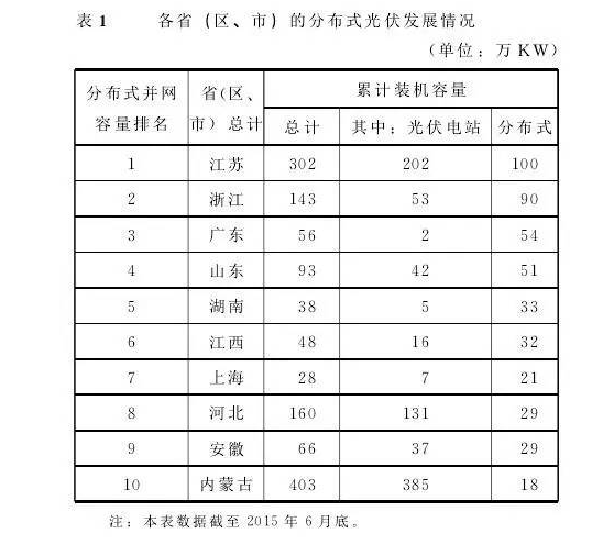 从国际发展水平看,中国由于电网特点与开发条件,分布式光伏处在探索与发展阶段,与全球发达国家相比仍存在差距。目前,发展较快的省份主要集中在中、东部地区,排名前五位的省份是江苏(100万KW)、浙江(90万KW)、广东(54万KW)、山东(51万KW)和湖南(33万KW)。中国的分布式光伏发展以“金太阳”工程和工业园区项目为主,住宅项目也在逐渐兴起。各省份的分布式光伏的发展情况如表1所示。