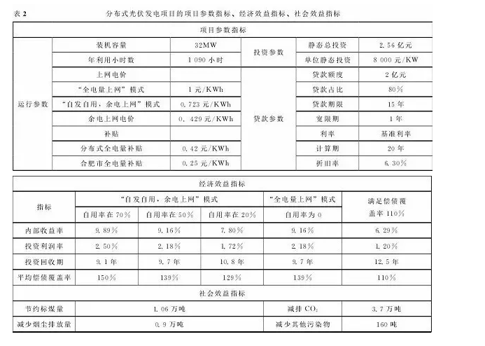 项目所在工业园区成立了园区分布式光伏示范项目的开发协调机构(园区管委会),负责协调发电企业与园区用能企业签订屋顶协议与合同能源管理协议,与园区所属电网公司签订余电上网收购协议。在此模式下,业主获得电费与补贴收入,用电企业享受优惠电价与节能效益,园区管委会负责协调屋顶与并网接洽并收取少量手续费,促进协议的签订和项目的正常运营,实现了多方共赢。本项目业主方集开发商、设备供应商、EPC承包商为一体,有利于发挥组织与协调优势,减少商业与操作风险,在简化商业模式的同时,促进光伏电池组件、逆变器等设备的消纳,形成多方互惠共赢的商业化运作模式。表2列出了分布式光伏发电项目的项目参数指标、经济效益指标和社会效益指标。