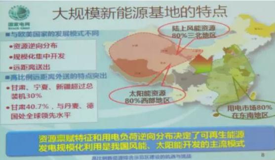 甘肃在最早批准建设千万千瓦风电基地,同时甘肃我们看到敦煌750变电所,是距离甘肃省用电负荷中心兰州有1000多公里,相当于北京到南京这样一个距离,在这样一个点上,是目前全世界一个变电所集中并网规模最大的,在这个点上集中并网800多万将近900万的风电和光伏。同时,它的送出电压等级750千伏,集中并网等级是330千伏,在这个区域有15座330千伏变电所集中接入,也是目前集中接入电压等压最高输出最远的基地。在这样的情况下,这条双回路750千伏输电网络,就承载着1000多万风光电的输送能力。