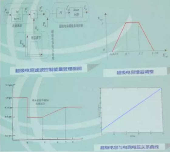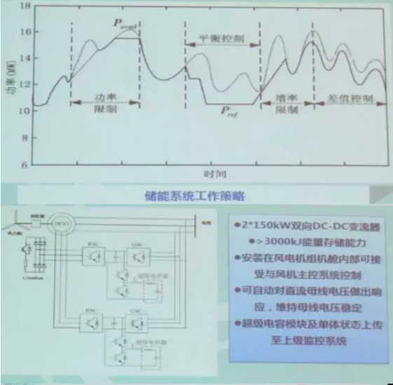 前面讲的出力波动,反映出我们对于特性的掌控,和对储能相应一种需求。这个项目实际上是我们和李主任一块做的国家863项目一部分,其中既包含了锂电池储能,也包括超级电容储能这样一些功能,同时还有一些其他的功能,我重点介绍一下储能,我们在储能跟别的地方做的不太一样,既有锂电池储能又在风电机组上加装了超级电能的储能,既有平抑波动的能力,因为超级电池的储能和锂电池的储能具有显著的特性。在整个里面选择了这样一个比较小的规模一个风电厂,加装了1兆瓦时锂电池储能,选择了3台风电机组。
