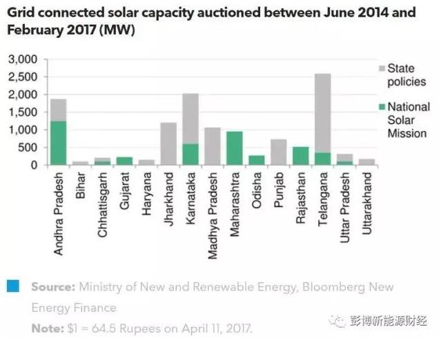 印度的光伏价格正在持续下降。2016年的最低光伏电价为每度电4.34卢比(折合$64.1perMWh)。2017年2月,光伏电价继续下跌至每度电3.31卢比(折合$49.38perMWh)。2017年4月11日,Engie公司甚至创下了每度电3.15卢比(折合$48.48perMWh)的光伏电价新低。