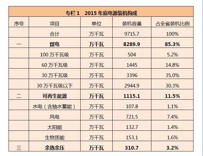 “十二五”期间,全省继续加大煤电结构调整力度,积极推进高效燃煤机组建设。至2015年底,全省已运行的最大发电机组容量为102万千瓦,百万千瓦级、60万千瓦级和30万千瓦级燃煤机组装机容量分别达到504万千瓦、1445万千瓦和3396万千瓦;60万千瓦级及以上、30万千瓦级及以上机组所占比重分别达到24%和64%,较“十一五”末分别提高2个和9个百分点。