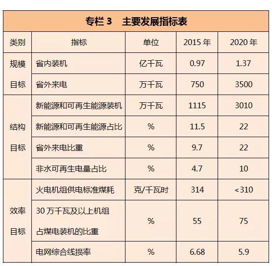 新能源和可再生能源电力装机容量3010万千瓦左右,约占省内电力装机的22%;省外来电占全社会用电量的比重提高到22%;非水可再生能源发电量占全社会用电量比重提高到10%。