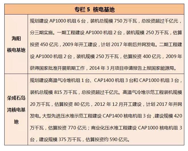 核电。建成海阳核电一期、荣成高温气冷堆示范项目;启动荣成大型先进压水堆示范工程、商业化压水堆和海阳核电二期、三期等项目建设;加强潜在核电厂址资源的勘探和保护,启动第三核电厂址前期工作。到2020年,建成核电装机270万千瓦。