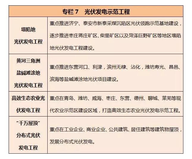 光伏。充分利用塌陷地、荒地、盐碱地,发展集中式光伏发电,重点打造鲁西南塌陷地光伏发电基地和黄河三角洲盐碱滩涂地光伏发电基地。结合高效农业区、产业园区规划,积极推进分布式光伏发电,建设一批分布式光伏发电规模化应用示范区和风光、农光、渔光等综合利用示范区。到2020年,光伏发电装机容量达到1000万千瓦。