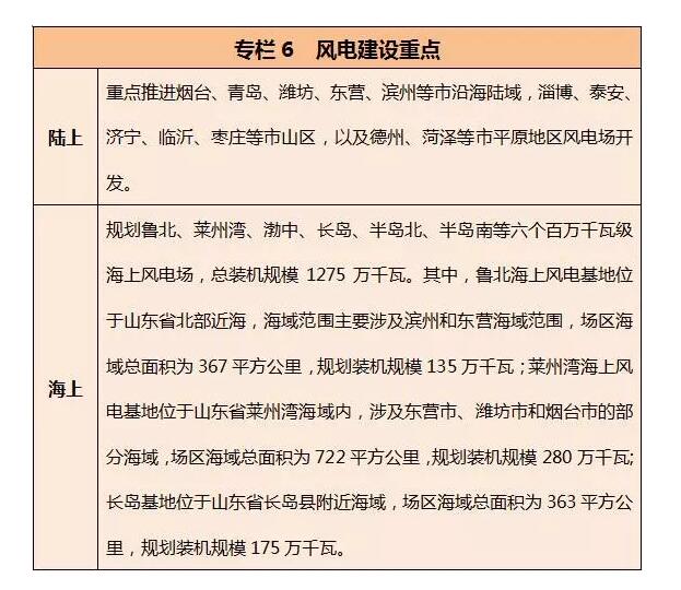 风电。加强风电布局与主体功能区规划、产业发展、旅游资源开发的衔接协调,推进风电规模化发展。陆上以青岛、烟台、潍坊、东营、滨州等市沿海陆域和淄博、泰安、济宁、临沂等市丘陵地带为重点,建成陆上千万千瓦级风电基地。适时启动鲁北、莱州湾、长岛等潮间带及近海风电场建设。到2020年,建成风电装机1400万千瓦。