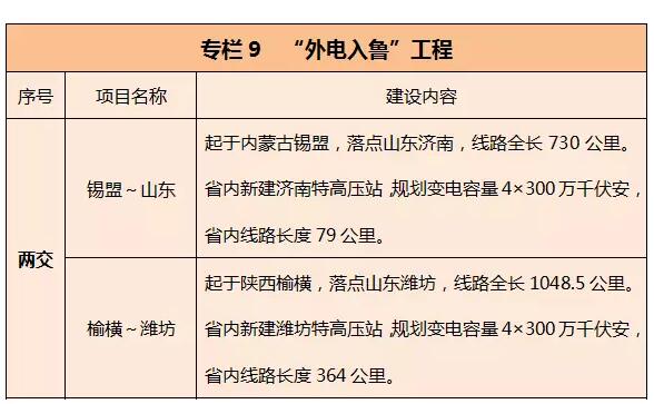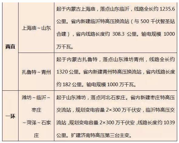 特高压电网。“十三五”期间,规划建设“两交两直一环”特高压工程,投运济南、潍坊、临沂、枣庄4座特高压交流变电站,以及临沂、青州特高压直流换流站。到2020年,形成“两交两直一环”特高压电网,全省接纳省外来电能力达到3500万千瓦左右。