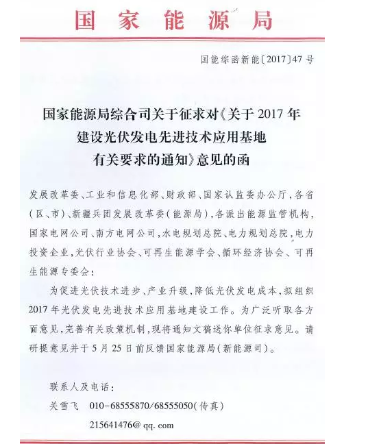 近日,国家能源局综合司对外征求《关于2017年建设光伏发电先进技术应用基地有关要求的通知》的意见。