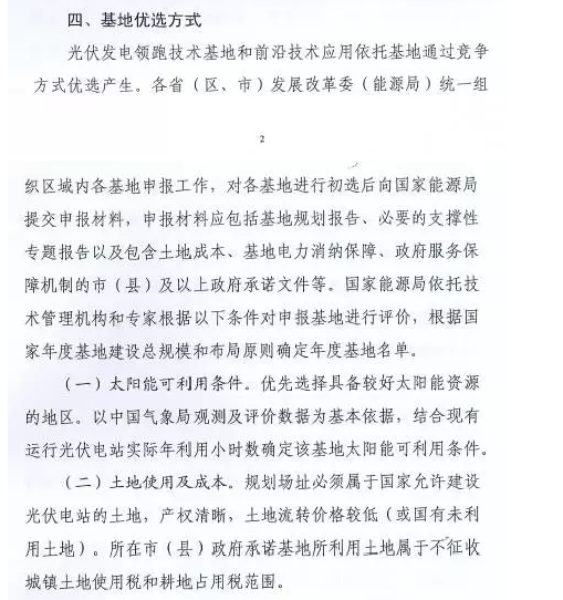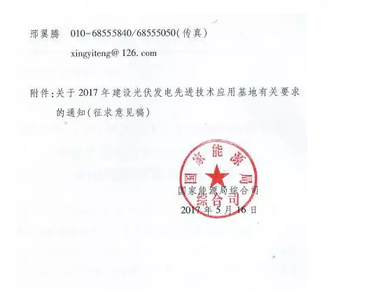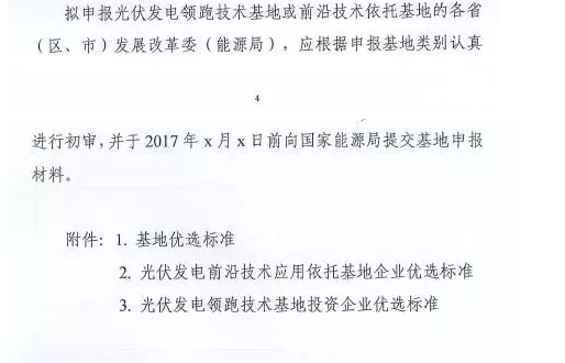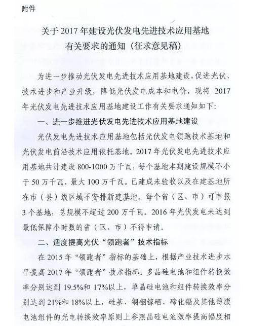 以下为《关于2017年建设光伏发电先进技术应用基地有关要求的通知》(征求意见稿)