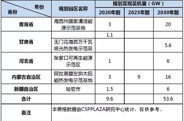 截止目前,据CSPPLAZA统计,青海省、甘肃省、河北省、内蒙古自治区和新疆自治区等相关省份和地区所规划的光热发电装机容量到2020年合计为9.6GW,到2030年合计为53.6GW。