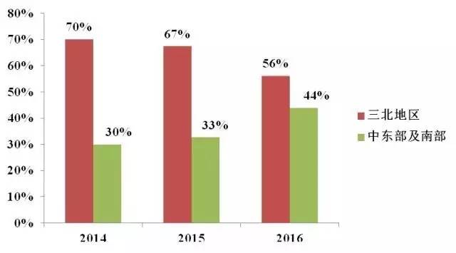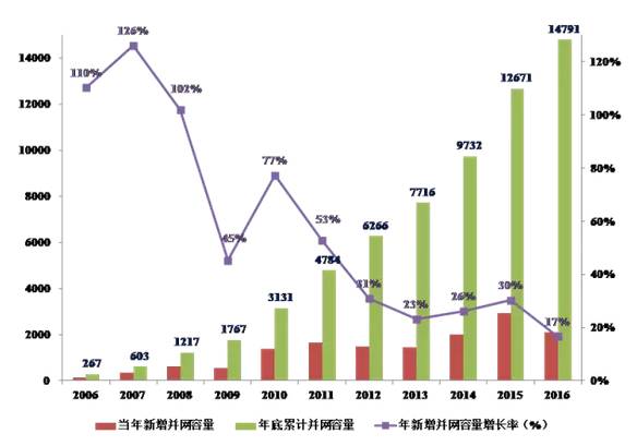 截至2016年全国风电累计并网容量14791万千瓦,年增长率同比降低13个百分点,为近五年最低(图1)。“三北”地区历年风电新增装机容量占比持续降低,风电开发重心继续向中东部和南部转移,从2014年的30%上升到2016年的44%,反映了国家对风电产业布局的调整和优化。另外,全国风电总投资较2015年减少25.3%,多年来首次出现下降;企业投资回归理性,更加重视质量和效益。