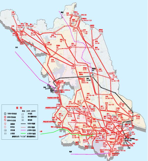 完善主干电网。适应锡盟—泰州、晋北—南京等跨省特高压输电工程建成投运的新情况,对外衔接华东电网,对内协调支撑电源,加快苏北及沿海地区负荷发展热点地区500千伏变电站布局和降压能力建设,加强苏中地区衔接特高压500千伏电网配套工程建设,优化苏南500千伏电网结构。到2020年,形成“六纵七横”500千伏网格结构。