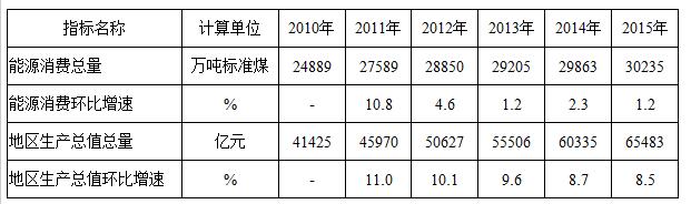 注:(1)能源消费总量为国家统计局核定数据。(2)地区生产总值及其环比增速来源于《江苏统计年鉴2016》,为2010年不变价。