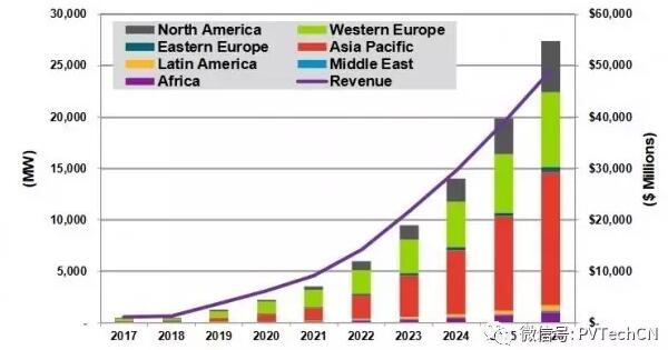 Navigant(法维翰)市场调研公司在其最新公布的报告中预计,在十年之内分布式太阳能+储能系统将在全球范围内达到27.4GW,价值超过491亿美元,其中亚洲和西欧市场将在这一领域内处于领先地位。