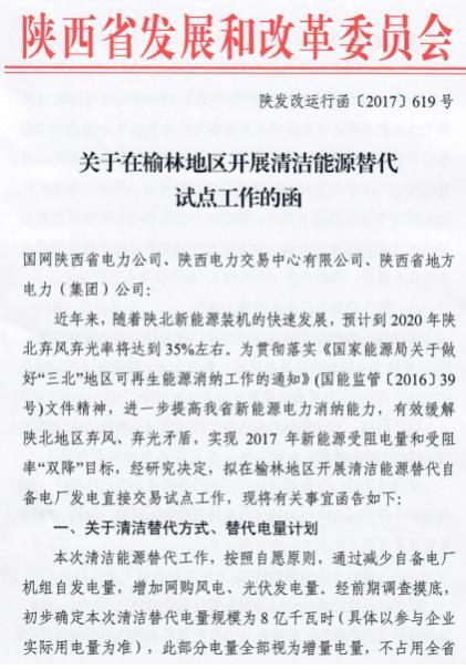 陕西省发改委日前发布了《关于在榆北地区开展清洁能源替代试点工作的函》,文件指出,在榆林地区开展清洁能源替代自备电厂发电直接交易试点,本次清洁替代电量规模为8亿千瓦时,此部分电量全部视为增量电量,不占用全省年度发电计划。清洁替代交易由陕西电力交易..