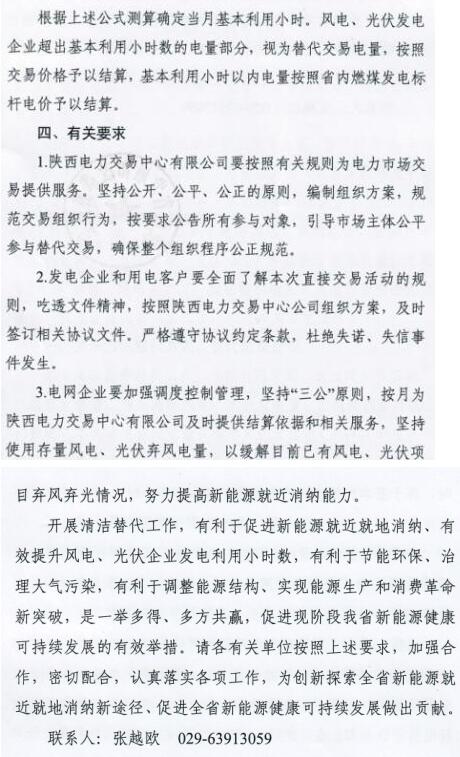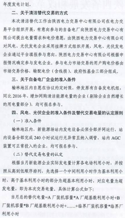 陕西省发改委日前发布了《关于在榆北地区开展清洁能源替代试点工作的函》,文件指出,在榆林地区开展清洁能源替代自备电厂发电直接交易试点,本次清洁替代电量规模为8亿千瓦时,此部分电量全部视为增量电量,不占用全省年度发电计划。清洁替代交易由陕西电力交易中心对风电、光伏发电企业采用挂牌方式组织开展,参与电力市场交易的用户购电价格由市场交易价格、输配电价(含线损)、政府性基金三部分组成。