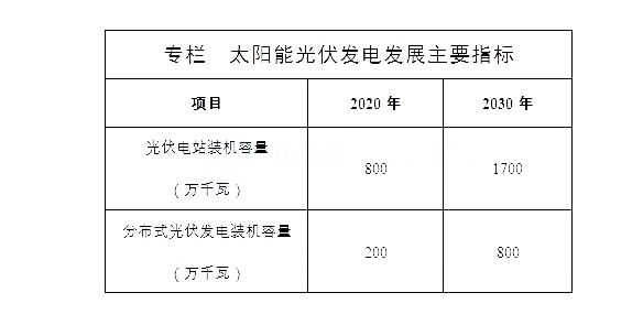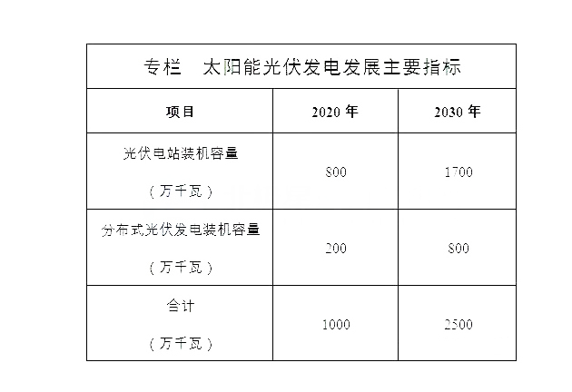 根据太阳能资源禀赋、场地条件、电网接入和消纳条件,坚持集中式、分布式并举,科学推进光伏电站建设,大力发展分布式光伏发电。力争到2020年,全省光伏发电装机容量达到1000万千瓦;到2030年,全省光伏发电装机容量达到2500万千瓦。