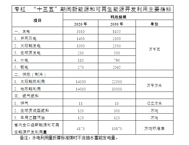 ——2030年。新能源和可再生能源发电装机容量比“十二五”末增长6倍,力争达到8155万千瓦,其中,风电2300万千瓦,太阳能发电2500万千瓦,生物质发电500万千瓦,水电790万千瓦,核电2065万千瓦;发电装机容量占省内电力装机容量的比重力争达到40%以上;年实现发电量2300亿千瓦时。