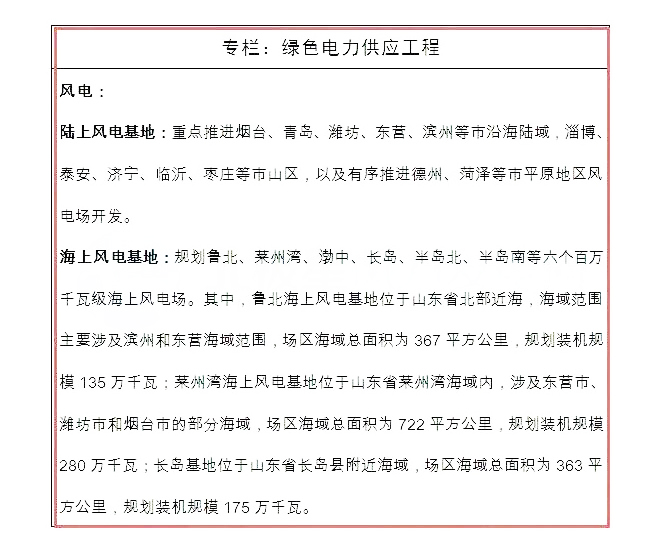 风电。重点围绕打造陆上、海上“双千万千瓦级风电基地”。近期,重点抓好华能蓬莱、华电龙口、国电长清、大唐平度、华润费县一批集中式、规模化风电场开发,建成陆上千万千瓦级风电基地;适时启动鲁北、莱州湾、长岛潮间带及近海风电场建设。远期,继续扩大陆上千万千瓦级风电基地开发规模;建成鲁北、莱州湾、长岛3个百万千瓦级海上风电场,启动渤中、半岛北、半岛南海上风电场建设,海上千万千瓦级风电基地初具规模。“十三五”期间,全省新增风电装机容量680万千瓦;“十四五”~“十五五”期间,新增装机容量900万千瓦。