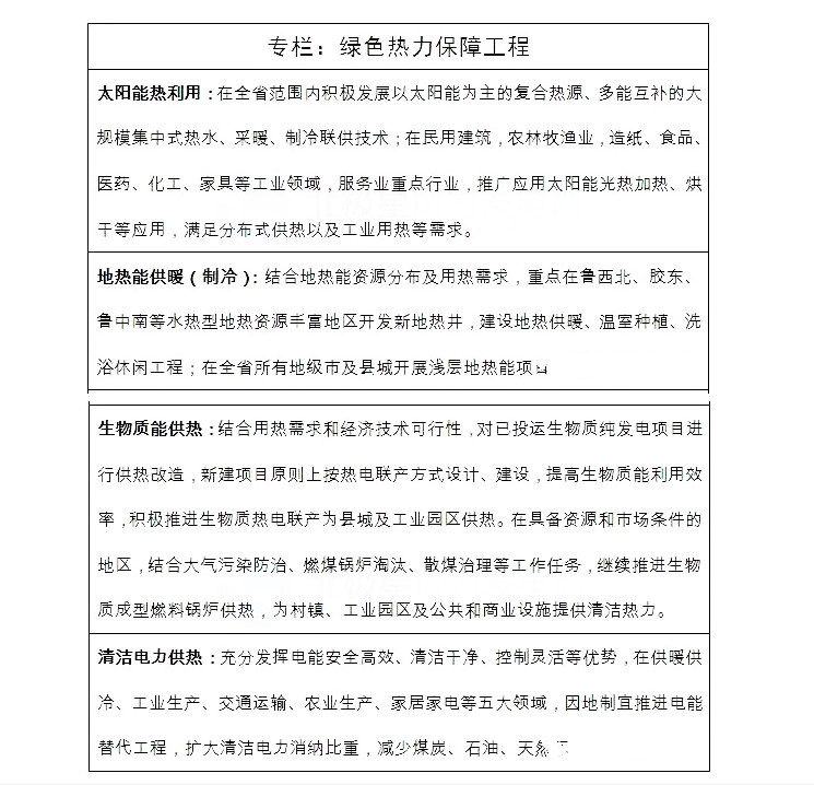 贯彻落实国家和我省大气污染防治行动计划有关要求,以太阳能、地热能、生物质能利用为抓手,积极推进可再生能源清洁供暖和工业供热,逐步实现供热资源和形式的多元化、灵活性,加快供热领域各类可再生能源对化石能源的替代。统筹规划建设和改造热力供应的基础设施,加强配套电网建设与改造,优化设计供热管网,建立可再生能源与传统能源协同互补、梯级利用的综合热能供应体系。“十三五”期间,全省新能源和可再生能源供暖占比提高2~3个百分点,力争到2020年达到10%以上。“十四五”、“十五五”期间,全省新能源和可再生能源供暖占比分别再提高2~3个百分点,力争到2030年达到15%以上。