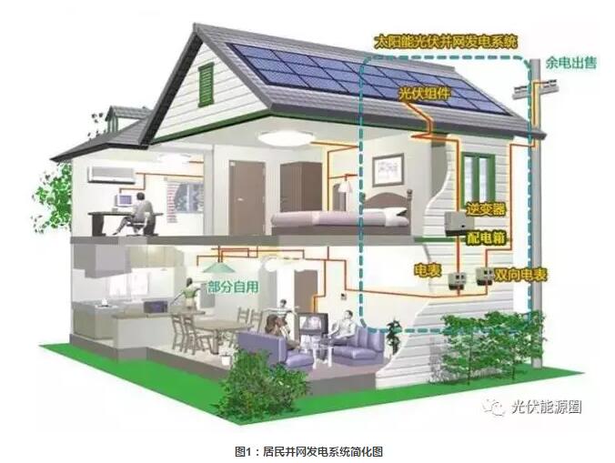 居民并网发电系统是将太阳能组件安装在居民屋顶,系统与电网连接,共同承担供电任务。组件在阳光辐射量达到发电要求情况下,系统中的逆变器将光伏发电系统所发的直流电转变为交流电,直接为居民家庭负载进行供电,不足部分由市电进行补充供给,而光伏发电量如大于居民家庭用电消耗量,则剩余的电能并入电网。发电系统的持有人也可选择直接将光伏系统所发电量全部并入电网。而在太阳能辐射量无法达到系统所需的发电要求的情况下,居民家庭负载所需的用电则全部由电网直接供给。