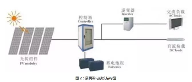 居民离网发电系统与居民并网发电系的工作原理十分相似,不同的是离网系统的电力不传送到公共电网而直接被负载消耗。考虑到光伏发电的波动性,如白天可以发电而晚上不发电,晴天发电量好阴雨天气发电量少或者不发电,居民离网发电系统需与配备蓄电池(组)。离网型太阳能发电系统由光伏组件,控制器,逆变器以及蓄电池(组)组成。
