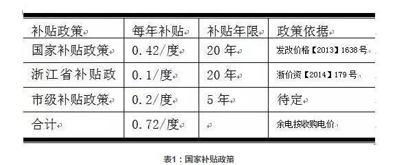 以浙江省安装居民光伏发电系统为例,根据现今的政策,对于居民光伏自发自用的电量,国家每度电补贴0.42元,补贴时限为20年,浙江省每度电补贴0.1元,补贴年限为20年,假设各市级补贴每度电0.2元(即将推出,补贴时限为5年),则合计居民光伏发电每度电补贴能达到0.72元。如光伏发电系统所发电量有余量,则电力公司无条件收购余电,并支付业主每度电0.45元。