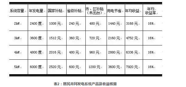 如居民自己投资光伏发电系统,根据上述补贴政策,同时假设居民用电价格为0.6/度,分别以2kW,3kW,4kW好5kW的光伏并网系统为例,假设所发电量均被居民负载消耗,则预测的年均收益率可达到16%,相比较于银行存款年基准利率(2.5%)或者是理财产品的收益率(5%),由此可见投资居民光伏发电系统有着收益高,风险小的优势。