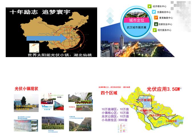 湖北省仙桃市创建“世界太阳能光伏风情小镇”,定位:建设智慧科技创新光伏小镇,打造水乡田园生态旅游洼地,目前已经建成的项目有:中兴云智慧平台、昌盛日电20MW农光互补,东旭光电20MW农光互补、中电长城10MW农光互补、天合光能600MW光伏电池片制造5个项目,东方日升50MW农光互补正在建设拟定6月30日并网,其他项目正在统一定位规划打包,用科技创新引领,建10万亩渔光互补;6万亩农光互补;3000户农户屋顶电站;2000万平米分布式光伏电站;35万平方米光伏博物馆;3000亩光伏小岛;3万亩光伏公园;2万亩光伏制造生产基地;100KM光伏水道;100KM光伏走廊;10万平方米光伏淡水鱼水族馆;光伏水上乐园;光伏沙滩浴场;光伏拓展营地;光伏直升飞机场;光伏旅游车;复古湿地光伏文化,包括诸葛亮光伏科普八卦阵,洪湖赤卫队光伏野营基地,野鱼25种捕捉方法体验基地,徐狗三光伏乐园,光伏沔阳皮影戏,光伏沔阳花鼓戏,仙桃1号金水1号桃形李等贡品水果采摘园,农产品可视种植…等等。全方位多领域创新。目前正在申报”太阳能光伏小镇”,一期面积30平方公里,一期投资500亿,政府20亿引导基金已经到位。“到了这里,就不用去德国”。高端的装备制造,全新的盈利模式,奇特的生态旅游,广泛的科普体验,切实的产研结合,系统的科技创新。搭建创新舞台,齐聚天下英豪,助力科技梦想,展现光伏强国。