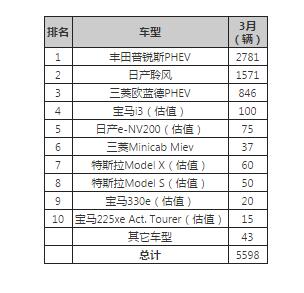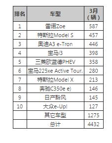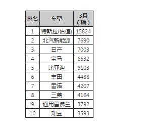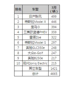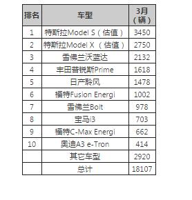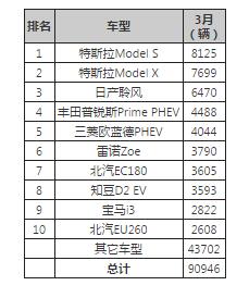 全球3月新能源乘用车销量排行:特斯拉Model S和Model X包揽冠亚军