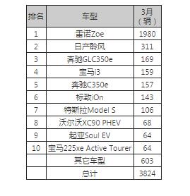 在排名前五的车型中,除了日产聆风(销售311辆)和宝马i3(销售159辆)两个常进榜车型外,奔驰的两款插电式混合动力车型也表现不俗,SUV GLC350e达到创记录的169辆,排名第三,C350e轿车也大卖157辆,排名第五,而这款车2月仅排在第32位。