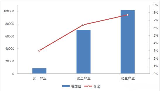 2017年一季度国内生产总值180683亿元,按可比价格计算,同比增长6.9%。第二产业支撑力提升。数据显示,一季度,第一产业增加值8654亿元,同比增长3.0%;第二产业增加值70005亿元,增长6.4%;第三产业增加值102024亿元,增长7.7%。其中,第二产业对GDP增长贡献率是36.1%。