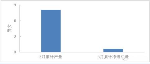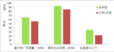 煤炭供应略有增加。2017年3月份,原煤产量为3.0亿吨,同比增速由负转正,同比增长1.9%。一季度原煤累计产量8.1亿吨,同比下降0.3%;煤炭净进口6225.8万吨,同比增加1658.1万吨。1~2月份煤炭企业、重要电厂、港口煤炭库存与2016年年底相比皆有回落。