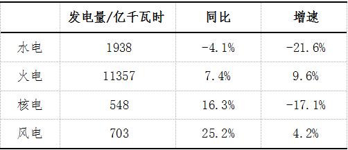 发电量增速同比提高。3月份,发电量5168.9亿千瓦时,同比增长7.2%;一季度,发电量14587.2亿千瓦时,同比增长6.7%,明显加快。火电增速加快,水电降幅收窄。3月份,火力发电同比增长7.7%;受来水情况影响,水力发电同比下降1.3%。一季度,火力发电同比增长7.4%,水力发电同比下降4.1%。核能、风力和太阳能发电保持两位数增长。一季度,核能、风力和太阳能发电同比分别增长16.3%、21.8%和31.0%。截至3月底,全国6000千瓦及以上电厂装机容量16.1亿千瓦,同比增长7.7%。其中,水电2.9亿千瓦、火电10.6亿千瓦、核电3473万千瓦、并网风电1.5亿千瓦。